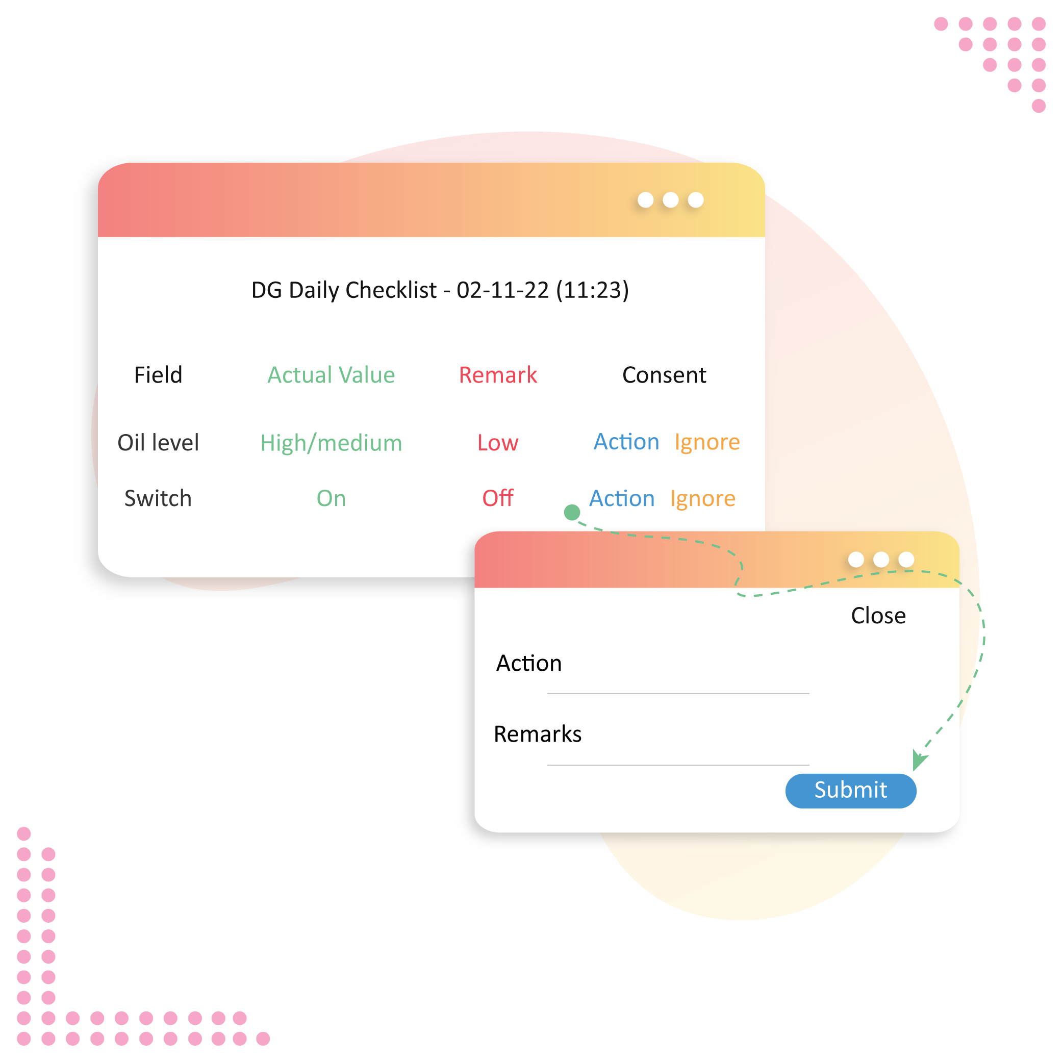 Real time alerts are triggered for all critically set parameters, so that equipment safety is assured paramount. The minute a deviation alert is triggered, location/asset in charge can attend the same immediately. This helps in reducing sudden breakdowns & downtime of assets ensuring smooth workflow. The checklist In-charge can reject a performed checklist, which in turn would alert the ground team to re-perform the same.