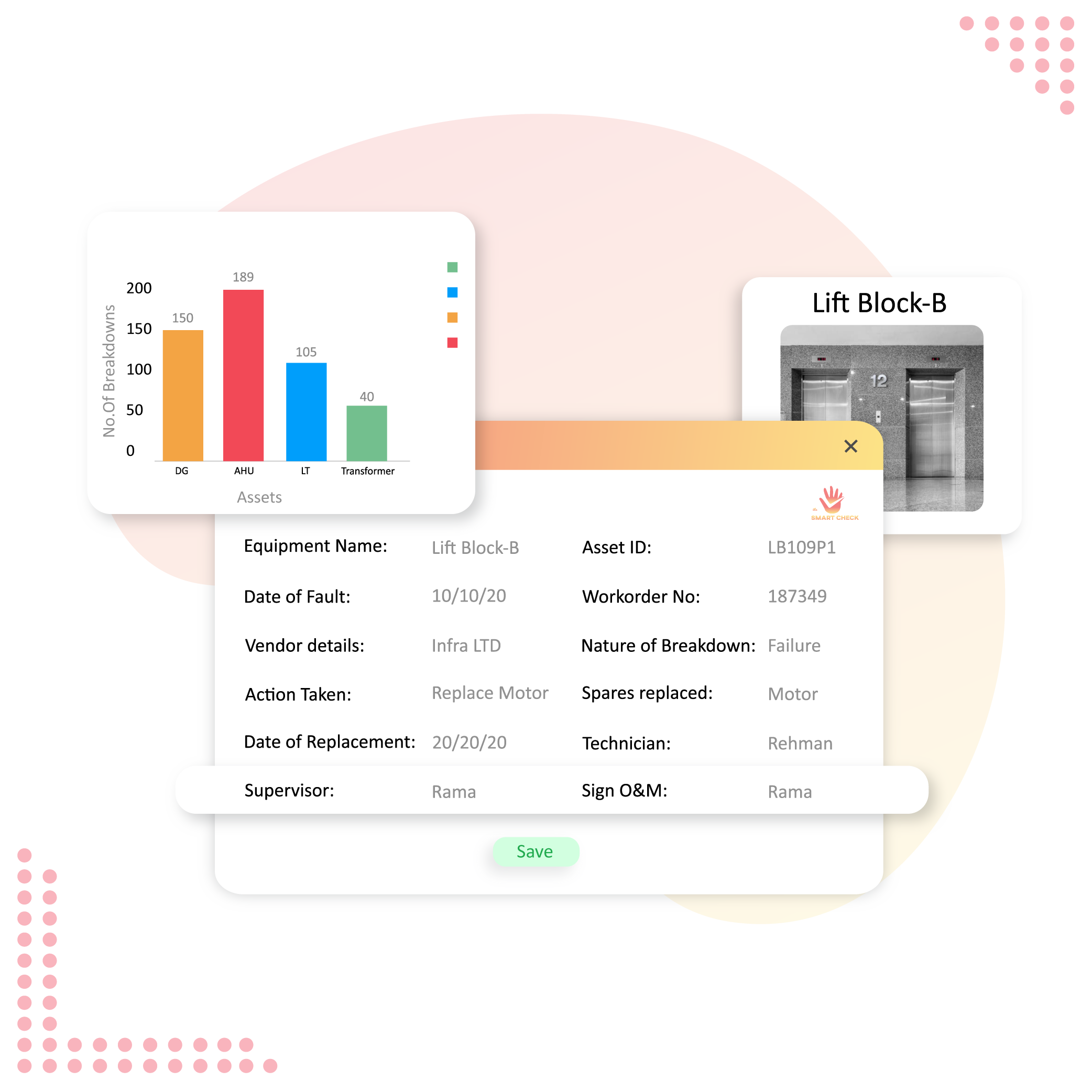 An Asset history card helps users to track the breakdown details of major assets critical to functioning of their facilities. Based on their requirements, SmartCheck Users/Technicians/In house members can add asset maintenance related actions pertaining to breakdown related data, spare parts replaced, vendor signoffs, etc.